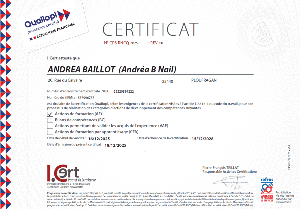 Andrea B Nail Academy est certifié Qualiopi au titre de la catégorie :
